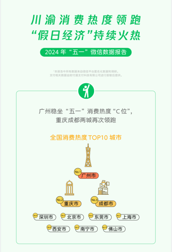 During this year's May Day holiday, Chinese travelers showed strong enthusiasm for travel. Data from the "2024 May Day Data Report" released by WeChat on May 5th shows that Guangdong’s four cities occupy four seats in the top ten cities with consumption heat nationwide. Among them, Guangzhouranks first nationwide, with Shenzhen, Dongguan, and Foshanranking fourth, sixth, and tenth respectively. Other cities on the list include Chongqing, Chengdu, Beijing, Shanghai, Xi'an, and Nanning.