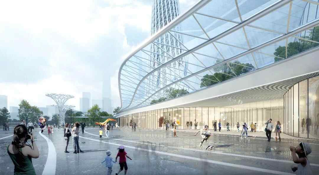 Canton Tower Plaza, centered around the Canton Tower, features a three-part layout of gardens, plazas, and gardens, imitating "ripples in the water ", extending throughout the plaza and green spaces. The Pearl River views integrate with the concept of "Pearl Water Ripples, Dancing Flower City ", presenting significant charm. The mall establishes a "double first-floor" shopping area and plans five major space sections including two sunken courtyards, a water feature art exhibition and the Lingnan New Garden, incorporating Lingnan elements to create a new urban landscape that blends traditional cultural memories with modern technology.