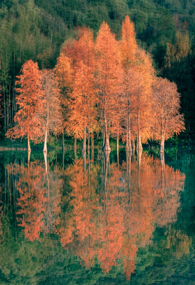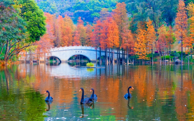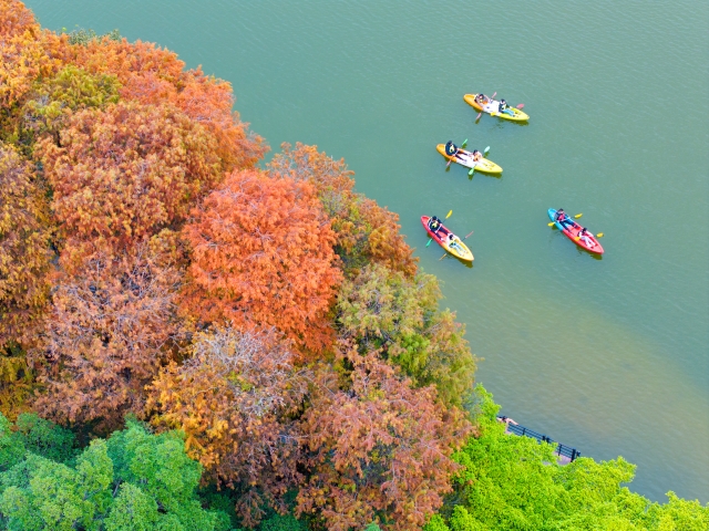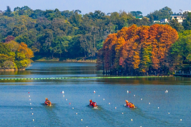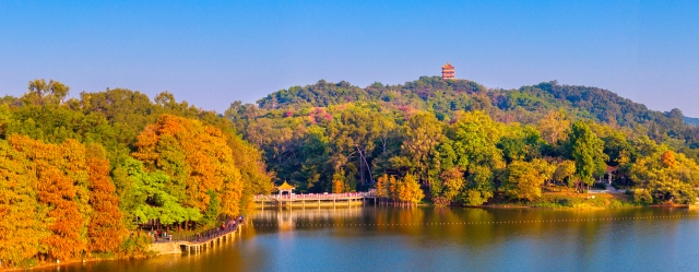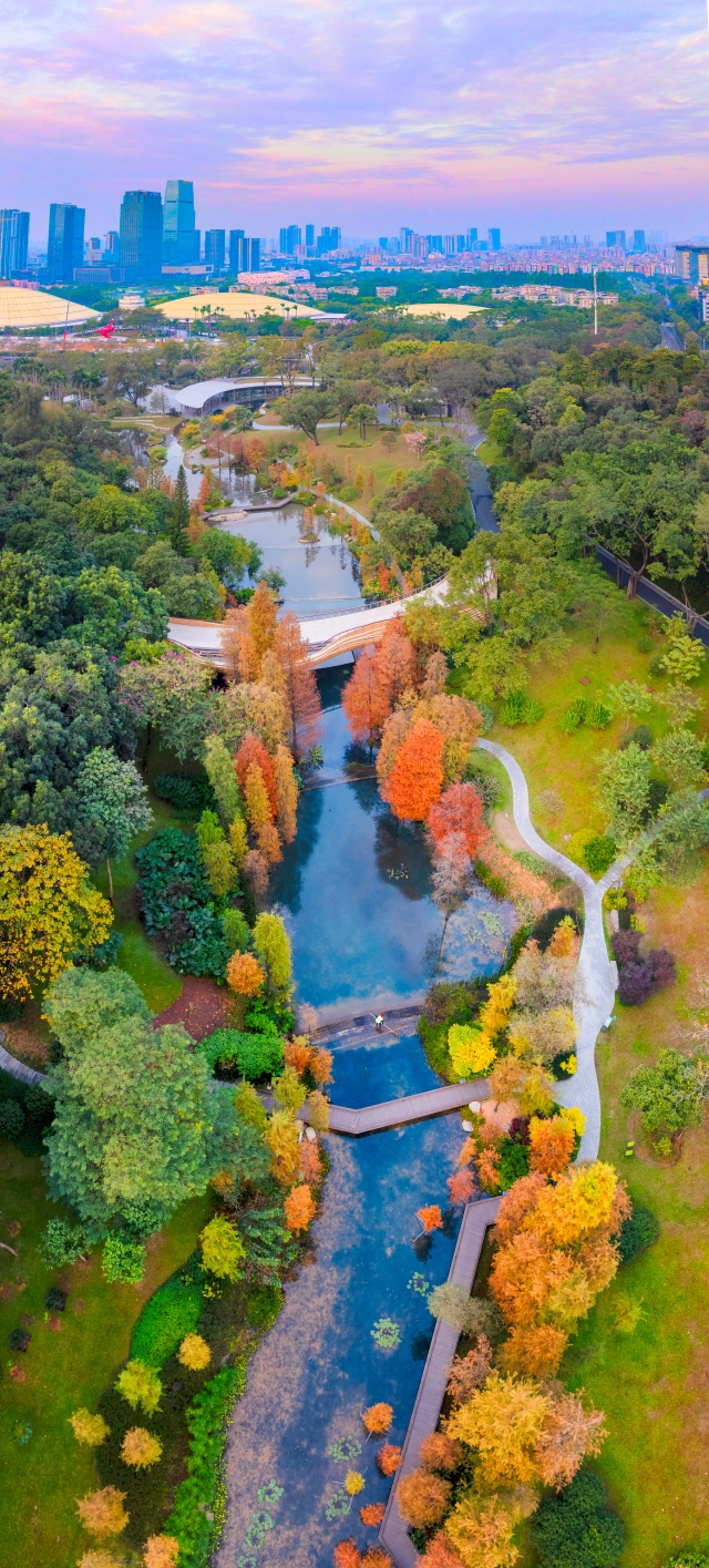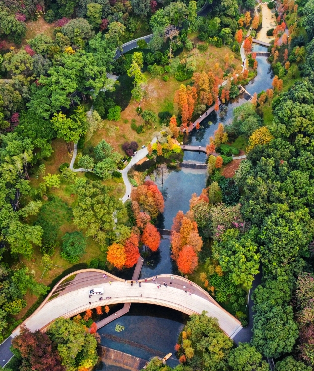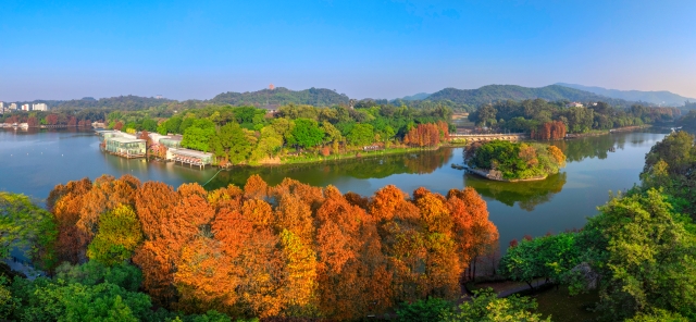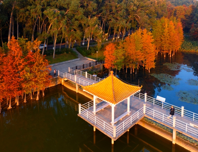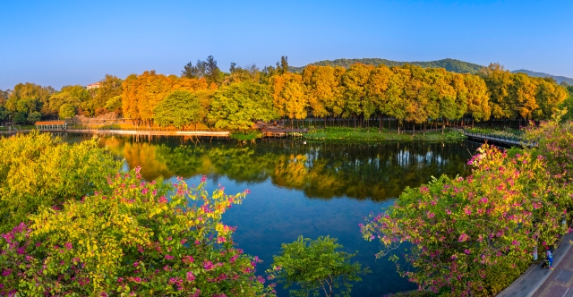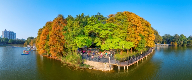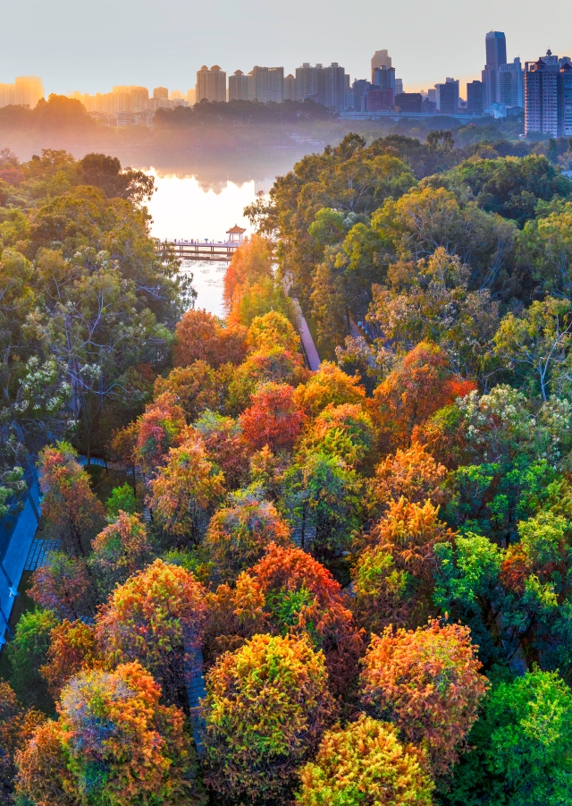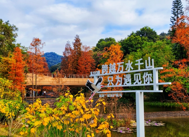 In winter, the Baiyun Mountain Scenic Spot in Guangzhou becomes a picturesque canvas of nature. The bald cypress trees, turning from green to gold and brown, create a vibrant multicolored forest against the backdrop of lakes and mountains. Each step along the mountain's trails, whether by the creek, boardwalk, or bridge, offers a view as beautiful as a painting.
