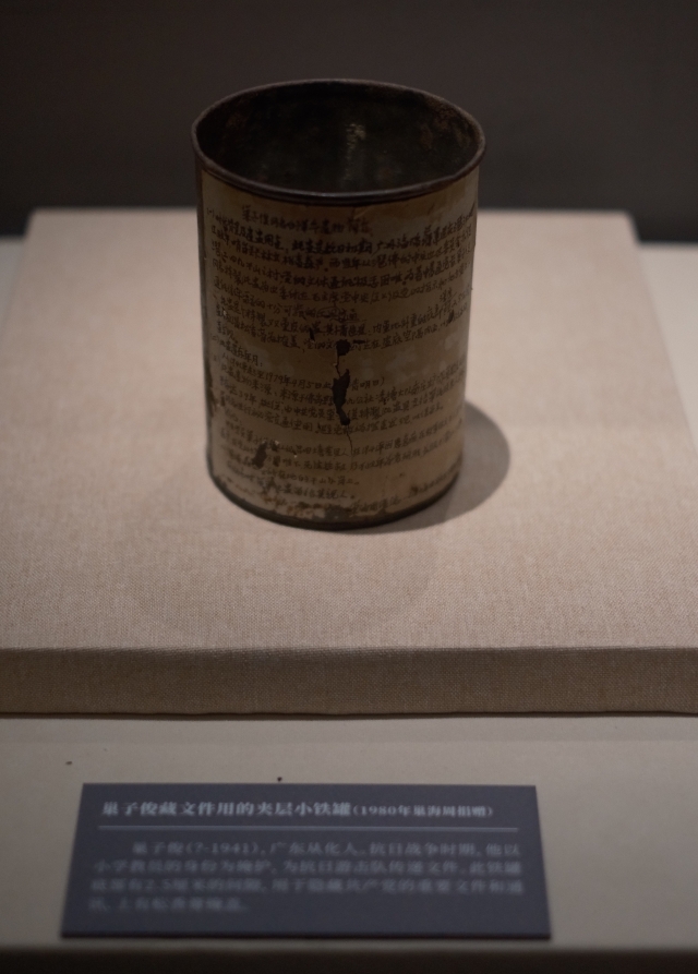 One of the most eye-catching objects on display is a small iron canister once used by underground Party courier Chao Zijun to secretly transport documents. With a false bottom concealed under resin, the canister helped deliver critical communications while Chao worked under the guise of a primary school teacher during the war.