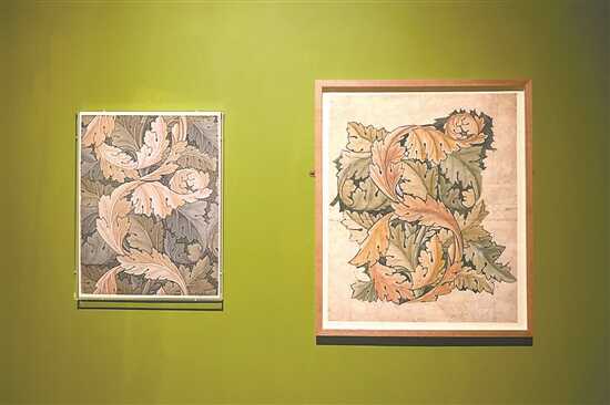 The exhibition hall of "William Morris: Invigorating British Arts and Crafts" is predominantly themed in a soft green color. It is complemented with natural patterns such as flowers and grass, creating a particularly refreshing and pleasing atmosphere.