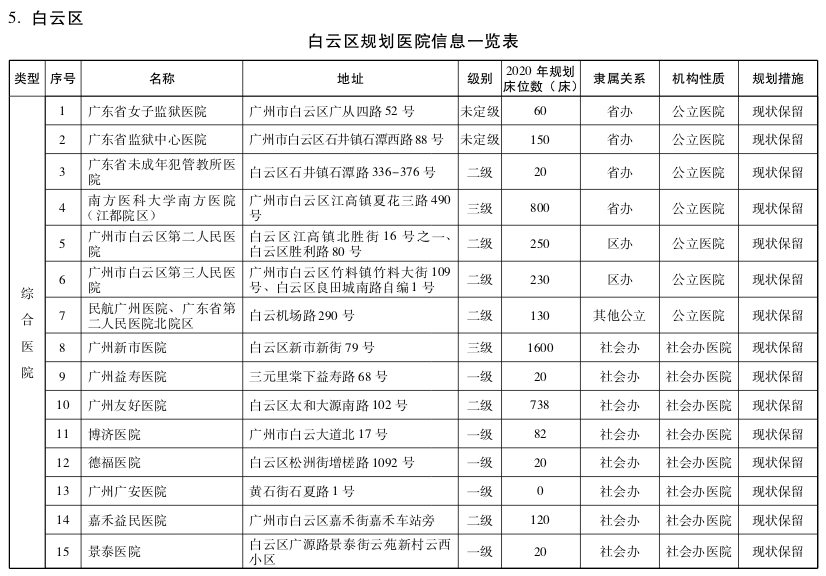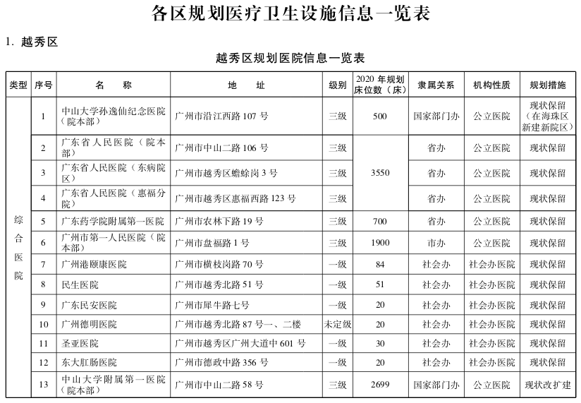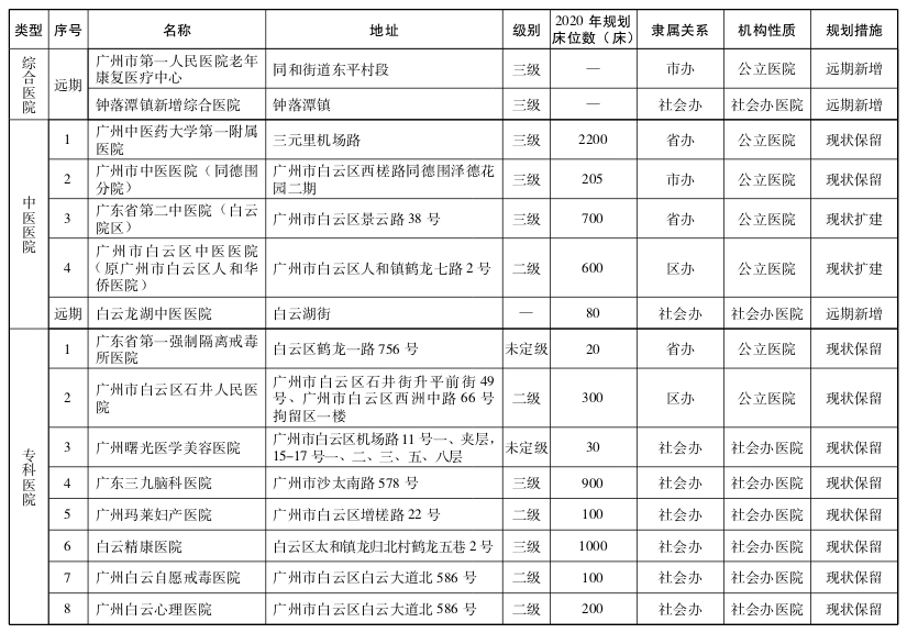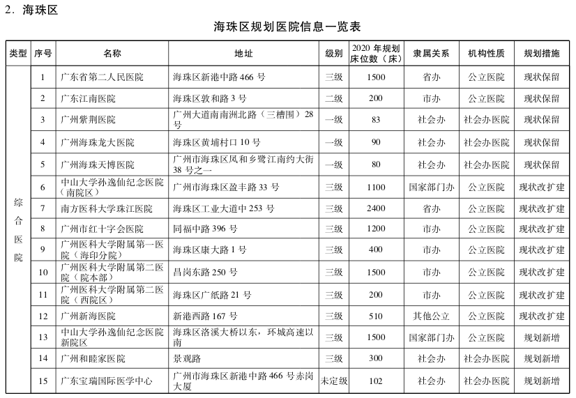 2020年,廣州市共規劃綜合醫院169間,其中現狀保留87間,規劃新增22間,改擴建(含遷建)60間。
