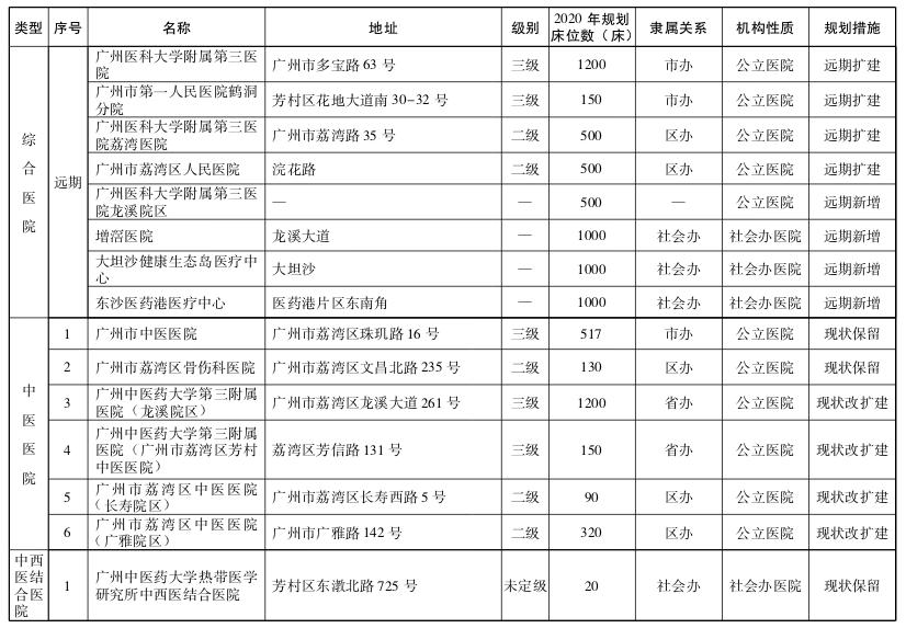 2020年,廣州市共規劃中醫醫院(中西醫結合醫院)40間,其中現狀保留19間,規劃新增3間,改擴建(含遷建)18間。