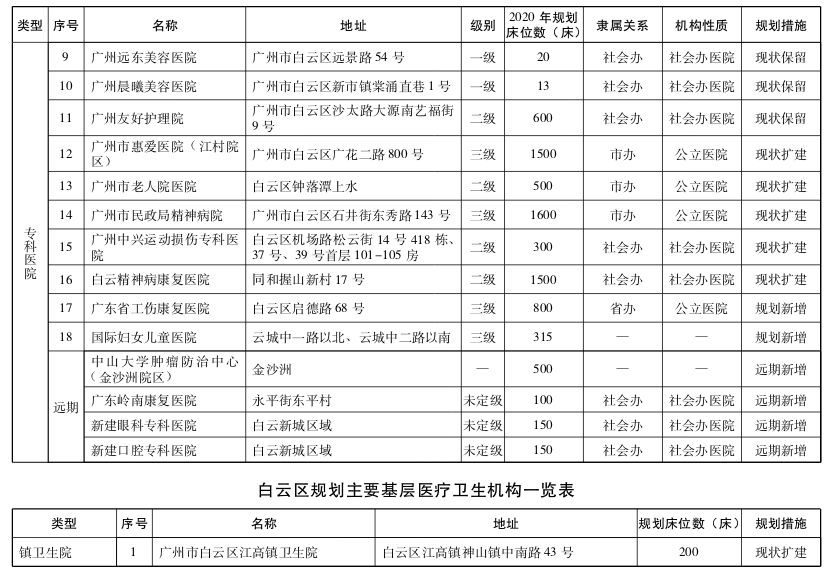 白云區為擴容提質區。白云南部未來應實現“量足”到“質優”的轉變,重點調整醫療資源布局和結構,重點增加康復、老年護理、婦女兒童、精神衛生等緊缺專科的床位配置;白云北部著重擴容,在鐘落潭鎮、龍歸城等區域規劃設置相應規模的公立醫療衛生機構,適當增加床位配置;支持區內資源富余的二級以下公立綜合醫院,逐步轉型為護理院、康復醫院或者社區衛生服務機構,至少設置1家護理院、康復醫院或醫養結合機構;重點引進高水平社會辦醫療機構,建設廣州國際健康產業城、廣州國際專科醫療中心。