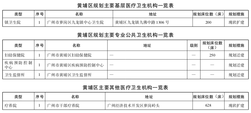 黃埔區為擴容提質區。調整黃埔南部醫療資源布局和結構,重點增加黃埔北部綜合、婦女兒童、腫瘤、康復等公立醫療資源配置;鼓勵社會資本設置第三方檢驗檢測、腫瘤、老年護理、康復、健康管理、互聯網醫院等醫療機構;至少設置1家護理院、康復醫院或醫養結合機構;大力發展健康產業,建設廣州科學城、廣州國際生物島、中新廣州知識城。