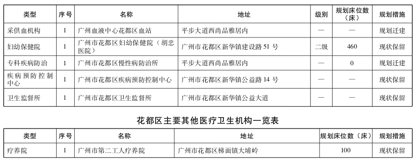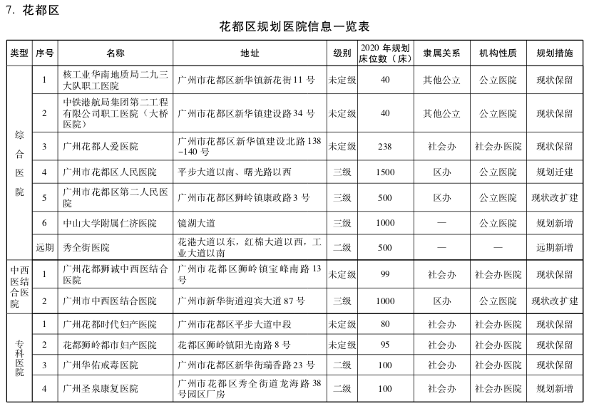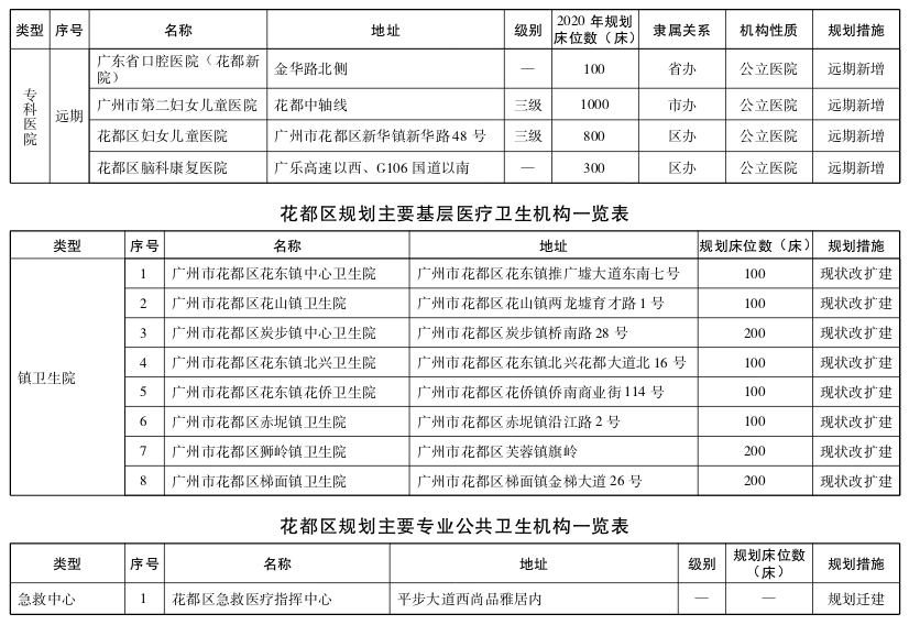 花都區為擴容提質區。加大對區域醫療資源的配置力度,重點增加婦女兒童、腦科、康復、口腔等公立醫療資源配置;增加鎮衛生院床位配置;鼓勵優質社會資本提供婦產、老年護理、康復、自愿戒毒等專科服務;至少設置1家護理院、康復醫院或醫養結合機構。