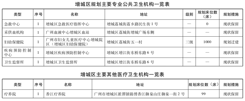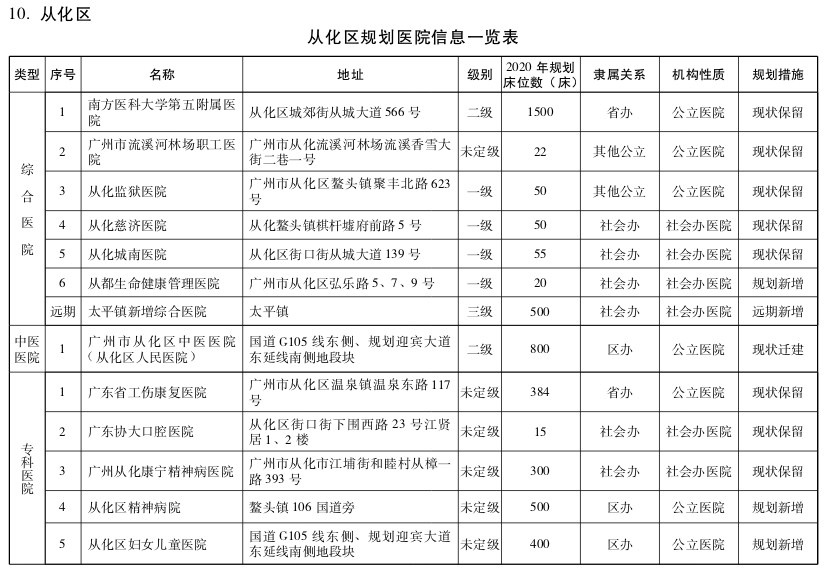 從化區為擴容提質區。加大對區域醫療資源的配置力度,增加綜合、婦女兒童、中醫、康復等公立醫療資源配置,在太平鎮等區域規劃設置相應規模的醫療衛生機構;鼓勵社會資本引進婦產、老年護理、精神衛生等醫療機構;增加鎮衛生院床位配置;至少設置1家護理院、康復醫院或醫養結合機構。允許從化區在現有規劃基礎上,規劃新增1家以上綜合或專科醫院。