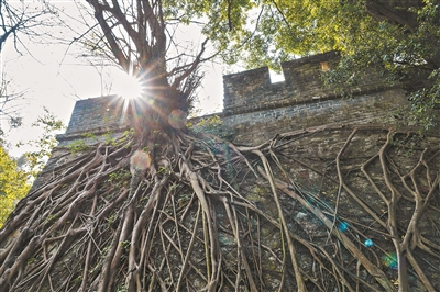 走進(jìn)越秀公園西門,可以看見一段殘存的明代城墻。這是廣州現(xiàn)存最古老的城墻,青磚布滿綠苔,榕樹在墻上盤根錯節(jié)。抬眼一看,絳紅的鎮(zhèn)海樓巍然屹立。