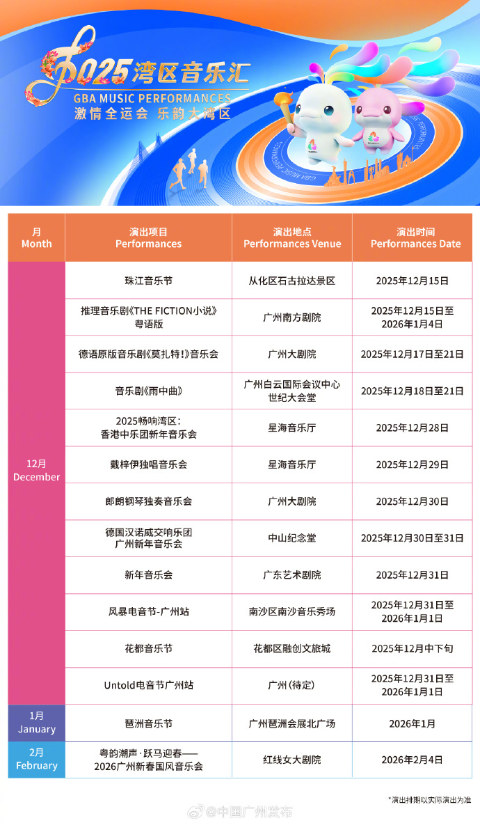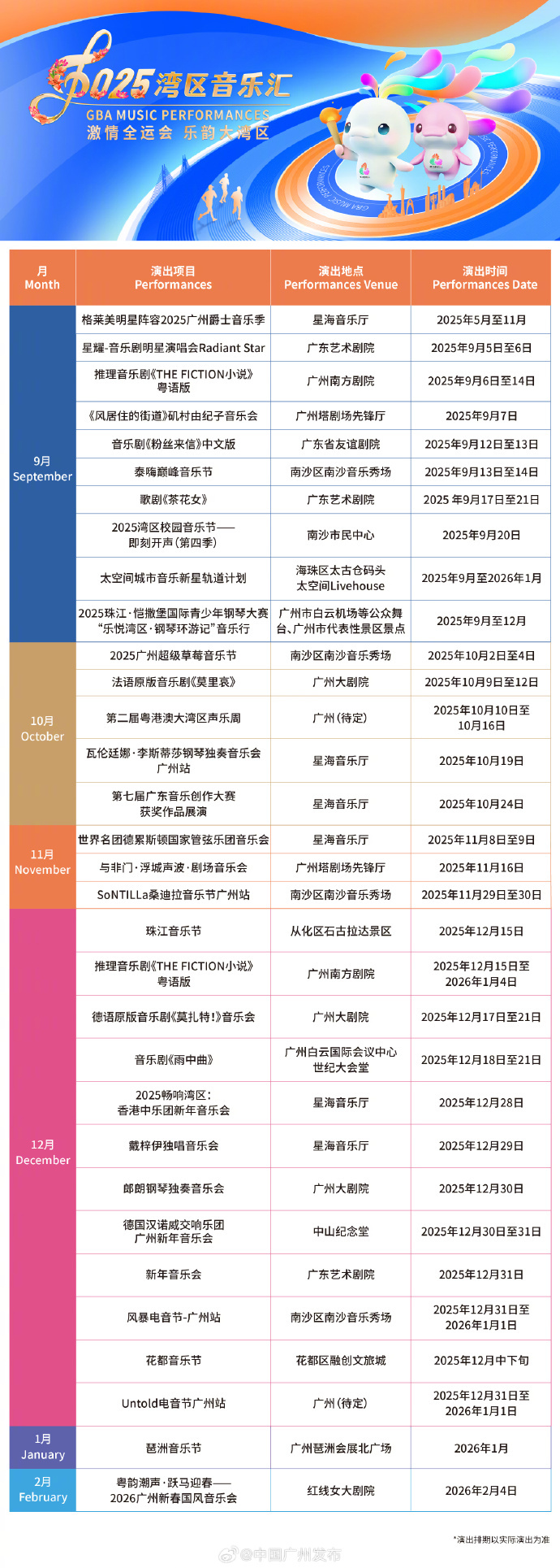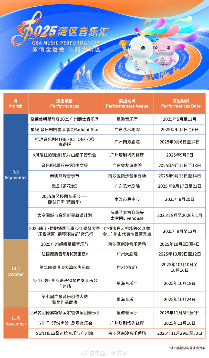 據(jù)悉,除開(kāi)幕大戲《茶花女》之外,本屆“灣區(qū)音樂(lè)匯”還將推出眾多亮點(diǎn)活動(dòng),持續(xù)至年底,涵蓋戶(hù)外音樂(lè)節(jié)、國(guó)際名家名團(tuán)演出、原創(chuàng)音樂(lè)推廣和本土音樂(lè)傳承四大板塊,共計(jì)130余場(chǎng)演出活動(dòng)。據(jù)悉,今年音樂(lè)匯規(guī)模進(jìn)一步擴(kuò)大,活動(dòng)覆蓋全市11個(gè)區(qū),演出場(chǎng)所不僅包括專(zhuān)業(yè)劇院,還延伸至南沙、花都、增城等戶(hù)外場(chǎng)地,著力構(gòu)建“全域舞臺(tái)、全時(shí)體驗(yàn)”的音樂(lè)生態(tài)布局。尤為值得一提的是,本次活動(dòng)與第十五屆全運(yùn)會(huì)深度融合,以藝術(shù)形式傳遞體育精神與拼搏激情。屆時(shí),來(lái)自全球二十多個(gè)國(guó)家和地區(qū)的藝術(shù)團(tuán)體及個(gè)人將登臺(tái)獻(xiàn)藝,在展現(xiàn)國(guó)際藝術(shù)視野的同時(shí),粵語(yǔ)音樂(lè)劇、廣東民樂(lè)等廣府特色節(jié)目也將集中亮相,進(jìn)一步促進(jìn)文旅消費(fèi)和夜間經(jīng)濟(jì)的提質(zhì)擴(kuò)容。