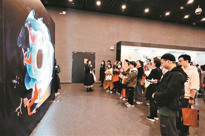 游園之余,廣州市文化館豐富多元的展覽和活動同樣吸引市民游客駐足。在中心閣二、三樓中空區域LED大屏幕前,大批市民掏出手機,與廣東獅鼓造型的LED聯動屏進行交互體驗。有市民在中心閣流連,在“參贊天地——嶺南傳統中醫藥非遺展”了解老字號中醫藥企業和傳統中醫藥文化的同時學習養生知識;有市民徜徉翰墨園,通過“金色華章山河頌——陳金章捐贈美術作品展”感受山河壯闊;還有的漫步廣府園,從“茶和天下興——海上絲路茶文化展”中真切感受茶文化魅力;還有的來到曲藝園,在欣賞經典電影中度過假日美好時光……