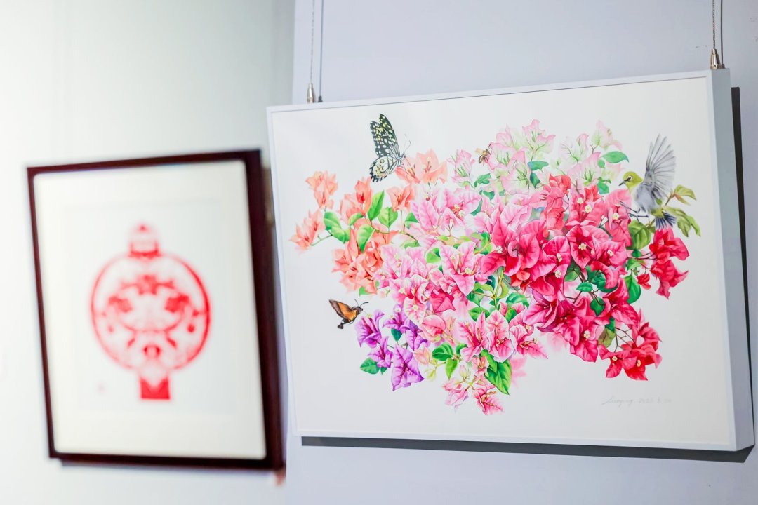 本次展覽特邀32位來自不同創(chuàng)作領(lǐng)域的藝術(shù)家,以簕杜鵑為共同的主題,展開一場(chǎng)跨越媒介與觀念的藝術(shù)對(duì)話。在這場(chǎng)對(duì)話中,可以看到傳統(tǒng)工筆以細(xì)膩筆觸勾勒其形神意蘊(yùn)體現(xiàn)東方美學(xué)的深邃意境;當(dāng)代油畫與抽象藝術(shù)則以奔放的色彩與筆勢(shì)詮釋其內(nèi)在的生命律動(dòng);現(xiàn)代裝置通過空間與材料的重構(gòu)演繹其生長(zhǎng)的變幻動(dòng)感與環(huán)境互動(dòng);玻璃藝術(shù)以其剔透質(zhì)感與光影流轉(zhuǎn)捕捉花葉間稍縱即逝的靈韻;非遺剪紙承古法而創(chuàng)新意,在鏤空的藝術(shù)中延續(xù)民間的審美智慧;影像攝影則定格其綻放的永恒瞬間,展現(xiàn)時(shí)間維度上的生生不息。