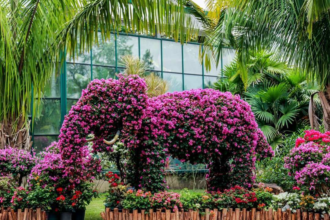 溫室群景區(qū)以珍稀品種與特異造型齊聚,展現(xiàn)三角梅的珍稀和妖嬈之美;正門廣場(chǎng)主要以大型藝術(shù)造型與古樸樹樁相映成趣,詮釋植物力量與藝術(shù)的融合;廣東綠美園區(qū)主要展示中小型盆栽和各色品種薈萃,呈現(xiàn)收集應(yīng)用的豐碩成果。三大展區(qū)共展出三角梅約600種(含品種),包括華南國(guó)家植物園栽培保育近半個(gè)世紀(jì)的大型老樁盆景、新優(yōu)品種、大型的花藝造型等。