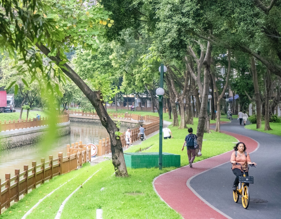 駟馬涌流經荔灣彩虹街、南源街兩個人口密集的片區,老城區居民對寬敞、新凈公共空間有迫切需求。整治工程將灌木雜亂、人車混行、高低錯落、空間狹小、居民親水活躍度并不高的駟馬涌兩岸,改造為疏林草地、視野開闊、人車分流、動線連貫、空間舒適安全的高質量濱水空間,最大限度滿足群眾交通出行、運動休閑、游憩娛樂的生活需求。