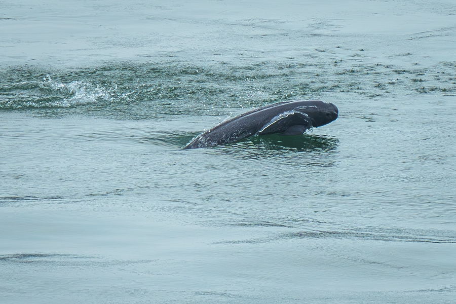 長江江豚在湖北省宜昌市葛洲壩下游水域逐浪嬉戲(2024年5月21日攝)。