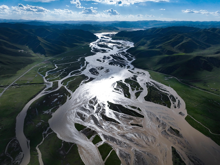 在青海省果洛藏族自治州達日縣境內拍攝的黃河(2024年7月31日攝,無人機照片)。