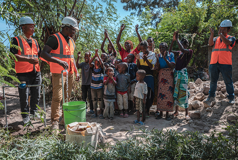 6月13日,在坦桑尼亞姆萬扎省米松圭,凱爾文(左二)與同事接通水管后贏得當地居民鼓掌歡呼。