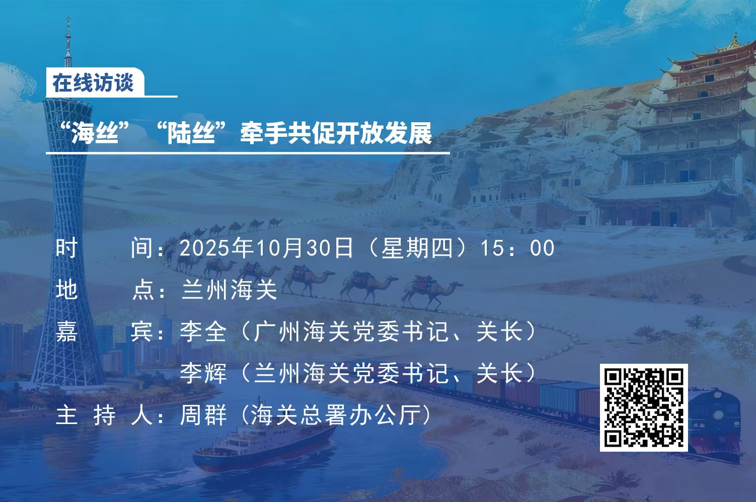 據(jù)廣州海關(guān)消息,該關(guān)聯(lián)合蘭州海關(guān)將于10月30日(星期四)下午15:00-16:00在中國海關(guān)門戶網(wǎng)站舉行題為““海絲”“陸絲”牽手共促開放發(fā)展”的在線訪談。屆時,廣州海關(guān)、蘭州海關(guān)主要負(fù)責(zé)同志將參與“在線訪談”并在線回答網(wǎng)友提問。