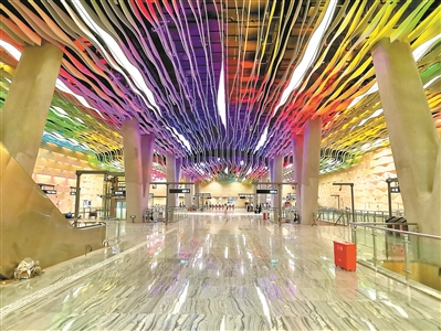 彩虹橋站站廳天花呈現七彩變幻的效果。