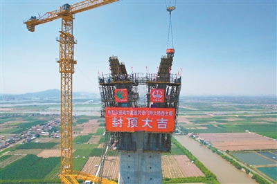 成功封頂?shù)哪现懈咚俸槠骈T特大橋西主塔