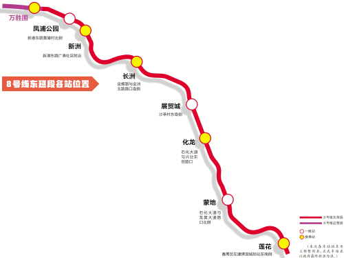 根據(jù)環(huán)評報告,8號線東延段(蓮花-萬勝圍)線路全長約18.0公里,為全地下敷設(shè),設(shè)7座車站。線路途經(jīng)珠金琶地區(qū)、長洲島、化龍鎮(zhèn)、智能網(wǎng)聯(lián)新能源汽車產(chǎn)業(yè)園、蓮花灣。和已開通的8號線一樣,東延段采用6節(jié)A型車,最高設(shè)計時速為80公里。