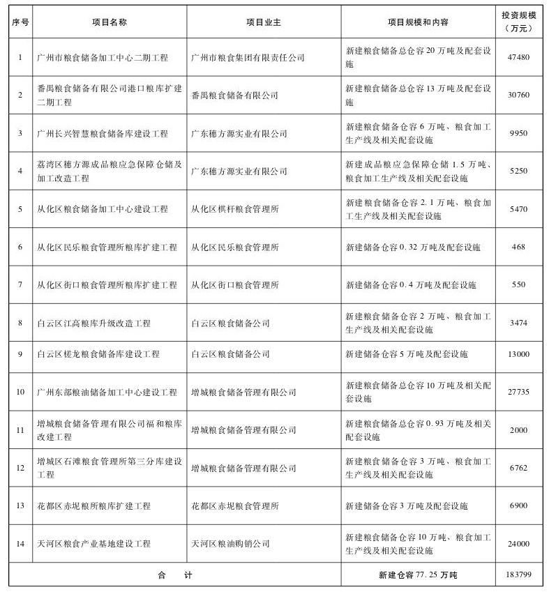 廣州市“十三五”時期重大糧食基礎(chǔ)設(shè)施建設(shè)項目表