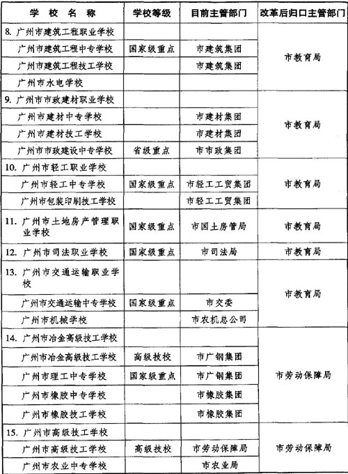 2.全市中等職業學校原則上統一以市、區(縣級市)行業冠名,如“廣州市電子(或機電、輕工等)職業(或技工)學校”。少數社會聲譽高或特殊性專業的學校,如國家級重點學校可保留原校名。新組建的學校可視具體情況加掛原校名。